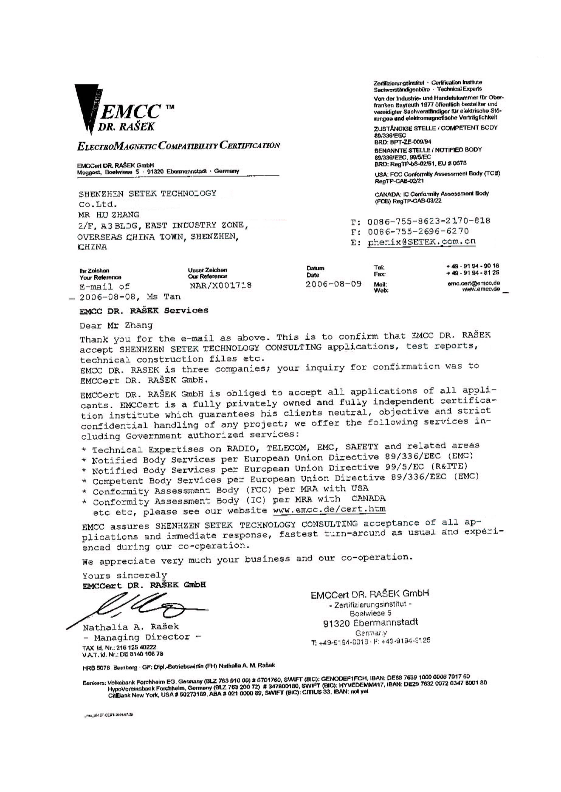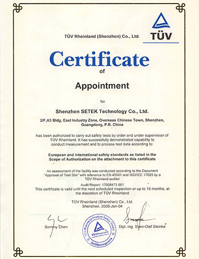 深圳市中檢通科技有限公司(Shenzhen SETEK Technology Co., Ltd.) 是一家專業從事電子電氣產品安全與電磁兼容檢測、測試、認證咨詢、技術咨詢與服務的獨立第三方機構。公司定位于為公共檢驗檢測服務、出具檢驗檢測報告、提供檢驗檢測需求咨詢等高新技術服務業。涉及的檢測領域有電磁兼容檢測、安規檢測、環保檢測、能效與可靠性檢測等5個大類的綜合性能檢測,同時提供專業的IOS客戶驗廠等國際管理體系認證咨詢、企業管理咨詢與培訓服務。能提供不同領域的檢測服務100多項檢測服務。涵蓋的產品包括:消費類電子、無線通訊終端產品、車載電子設備、音視頻/廣播電器、家用電器、照明設備、新能源電池、LED節能照明及玩具等產品領域。